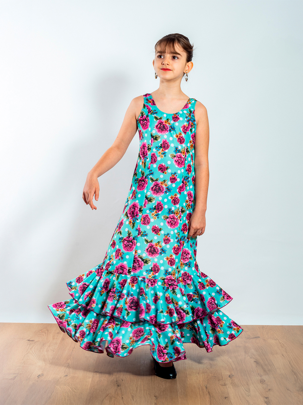 Disponibilidad en tallas desde la 4 hasta la 16, lo que asegura que cada niña pueda disfrutar de este hermoso vestido de baile flamenco, adaptado a su tamaño y estilo.