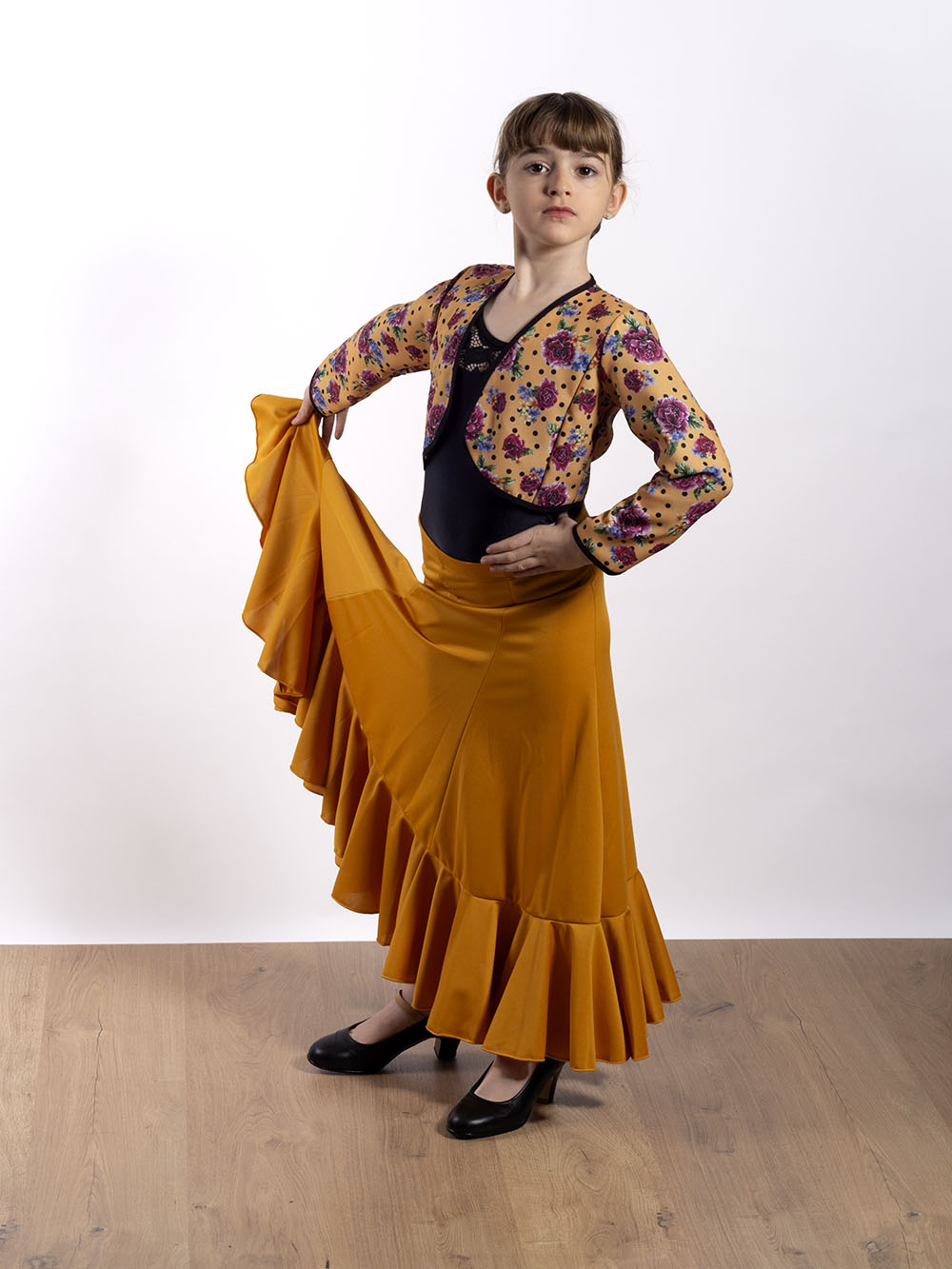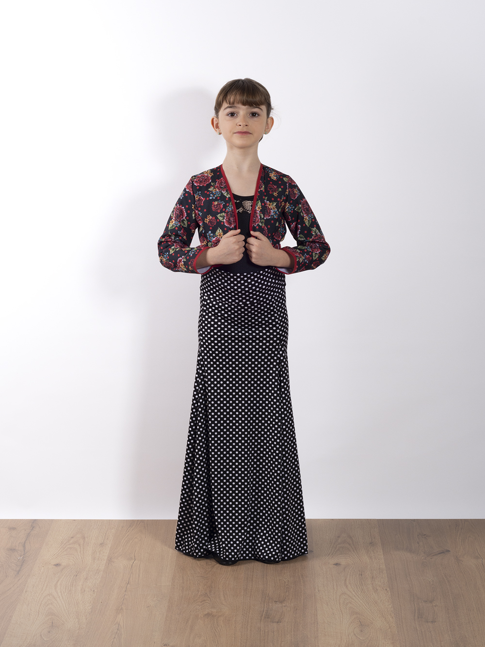 El tejido strech de la torera garantiza una combinación perfecta de durabilidad y comodidad. Esto no solo resalta la calidad de la prenda, sino que también permite a las niñas moverse con gracia y confianza durante sus actuaciones. Rematada con un vivo a tono con los lunares, permite añadir pasamanería y de este modo personalizar la prenda para vuestras actuaciones.